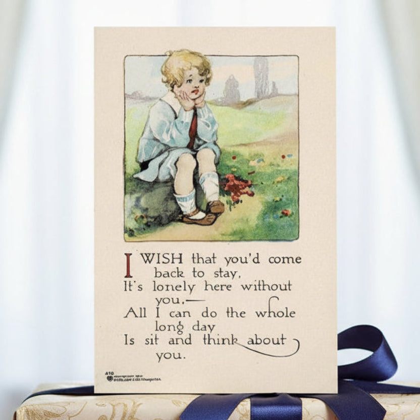 An illustrated 1913 vintage postcard of a forlorn child sitting on a hillside with his head in his hands. This would look great framed or make a nice addition to any collection.