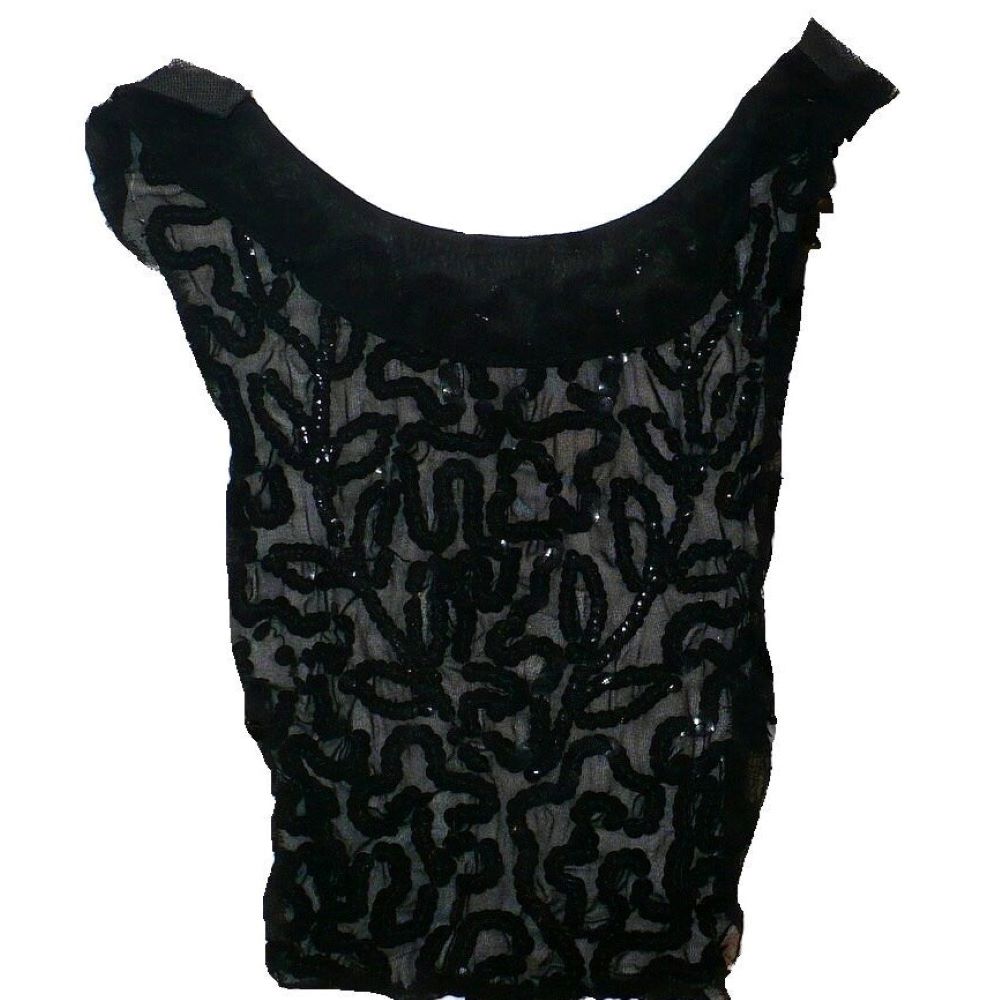 This stunning Art Nouveau-inspired black silk chiffon dress collar or insert features intricate leafy vine motifs, beautifully adorned with black spangles for a touch of sparkle. The piece hails from the Edwardian era and is designed as a modesty panel, vestee, or bib collar. Its elegant black color, combined with the luxurious silk chiffon fabric and sequins, makes it a unique addition for period fashion restoration, design projects, or sewing enthusiasts looking to incorporate a historical touch.