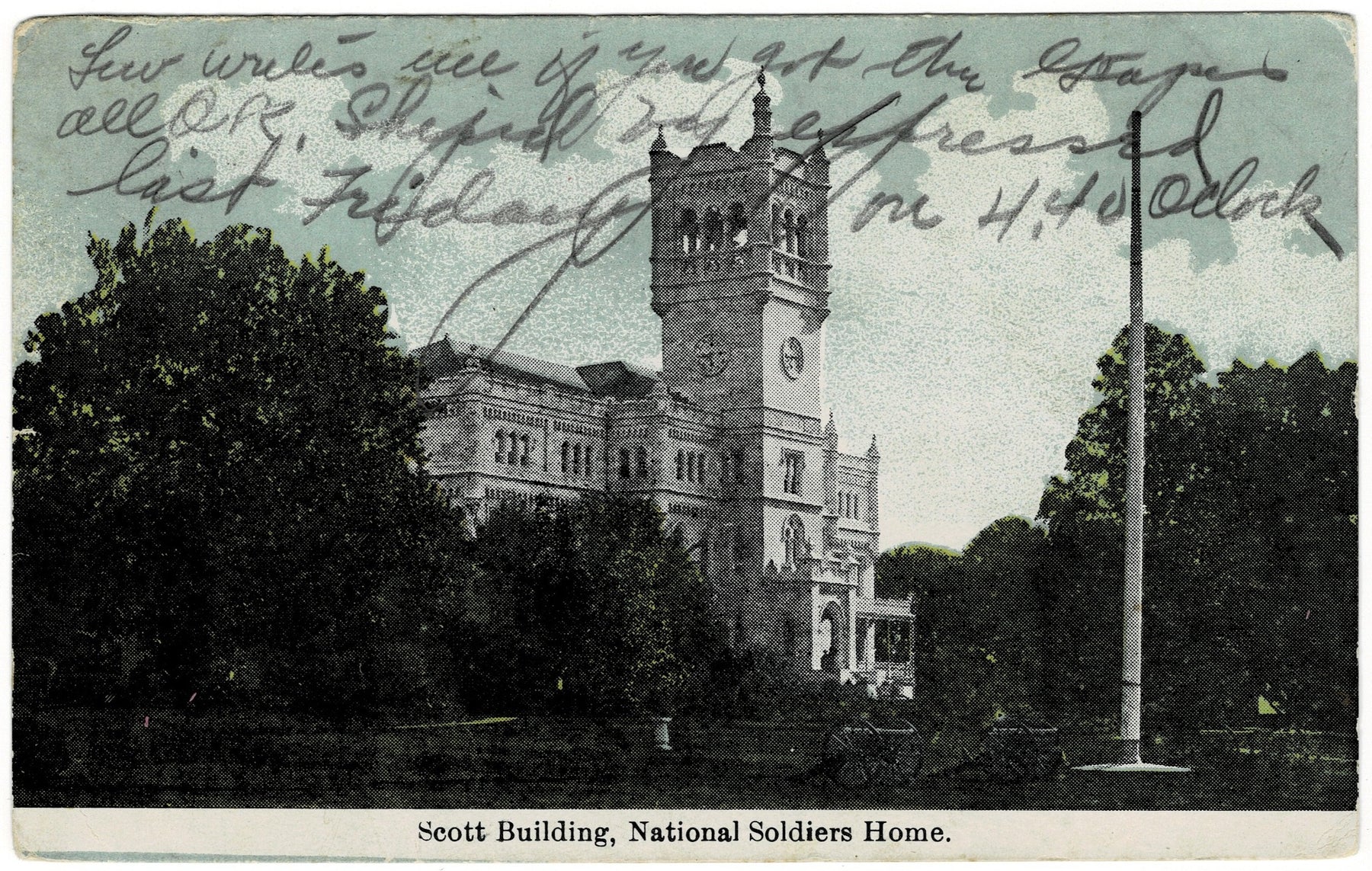 Postmarked 1919, this vintage postcard features the stately Scott Building—also known as the Sherman Building—at the U.S. Soldiers’ Home in Washington, D.C., located at Rock Creek Church Road and Upshur Street NW. Established in 1851, the Soldiers’ Home was one of the earliest federally funded retirement homes for enlisted soldiers, and this building quickly became its iconic centerpiece. With its dramatic castellated architecture and commanding clock tower, the Scott Building served not only as a residence but also as a symbol of national respect for aging veterans.