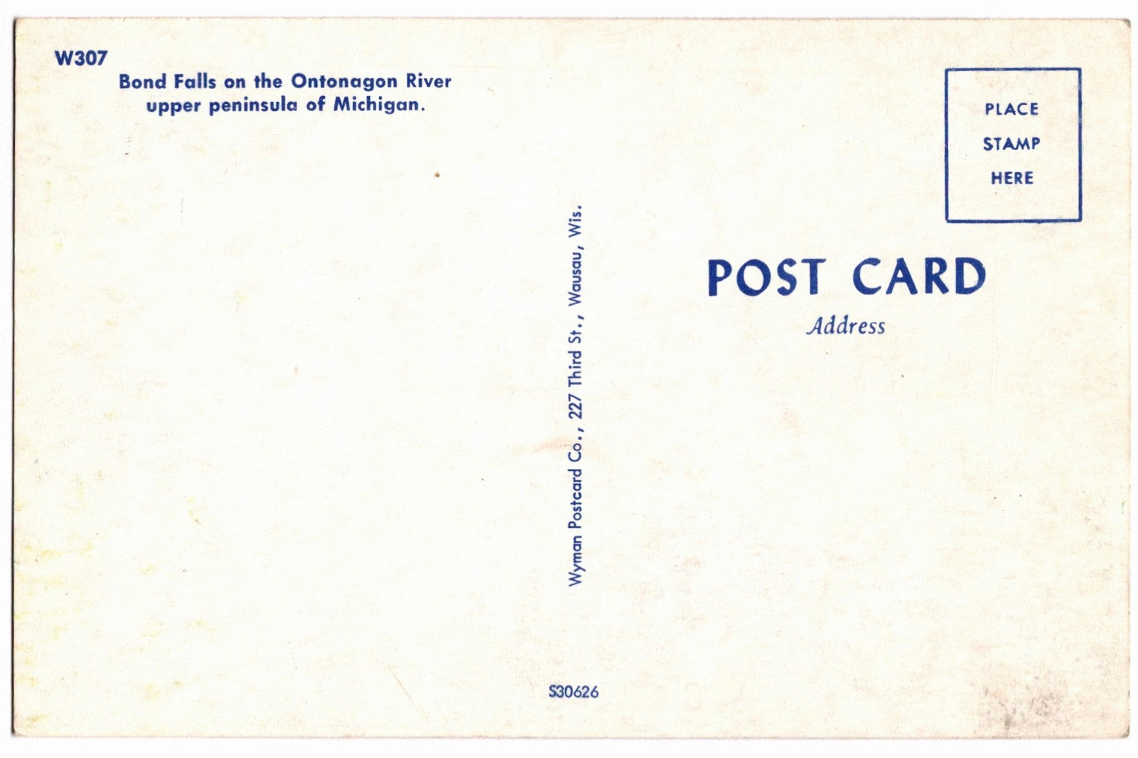 This postcard was produced by Wyman Studio of Wausau Wisconsin, a family-owned operation active since the 1930s known for photographing on-location across the Northwoods and Upper Peninsula specifically for their postcard line. This 1950s chrome-style card showcases the vivid natural scenery and photographic precision that make Wyman postcards distinctive and collectible.