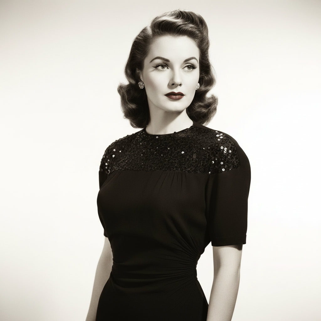 A rare and glamorous black evening blouse from the late 1930s to early 1940s, crafted from richly textured rayon pebble crepe. This piece embodies the elegance and drama of Old Hollywood glamour, with original metal Talon zippers at the back neck and left side, a rounded neckline, and short sleeves. Adjustable belting at each side seam to self-tie at the back. The silhouette is timeless, but it is the details that truly set it apart.