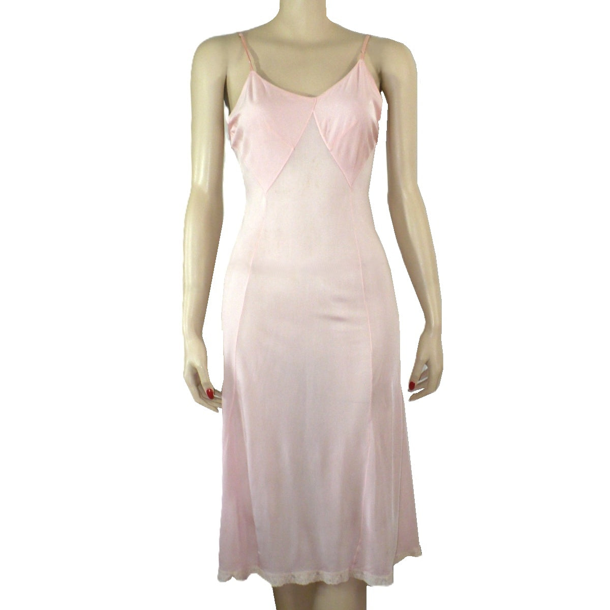 This 1930s-era tailored four-gore knit rayon full slip is body-clinging and sexy, designed to accentuate your curves. The pink jersey knit fabric is run-resistant, ensuring lasting wear. It features adjustable straps for a custom fit and delicate lace trim at the hem, adding a vintage touch of elegance.
