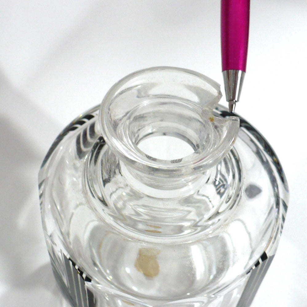 This elegant bottle works equally well on a gentleman’s or a lady’s vanity and is priced to reflect the flaw. It remains a fine example of interwar Czech Art Deco glass and a smart find for collectors or designers seeking authentic period detail.