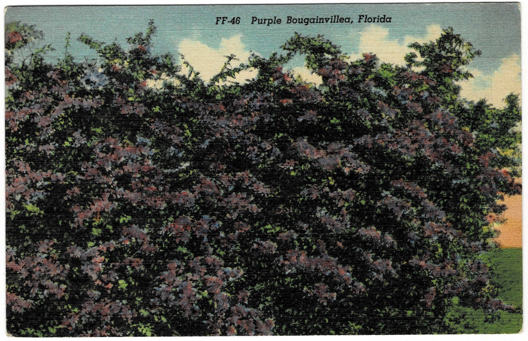 This vibrant 1939 postcard showcases the blossoming beauty of purple bougainvillea—a flowering favorite that quickly became a staple of Florida’s tropical charm. Thriving in the state’s warm, sunny climate, bougainvillea added bold color to gardens, resorts, and roadways across the region. By the late 1930s, it was a familiar sight to visitors exploring Florida’s blossoming towns and scenic byways. This card captures the elegance and romance of Old Florida in full bloom, framed by one of its most iconic flowering vines.