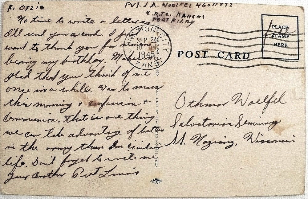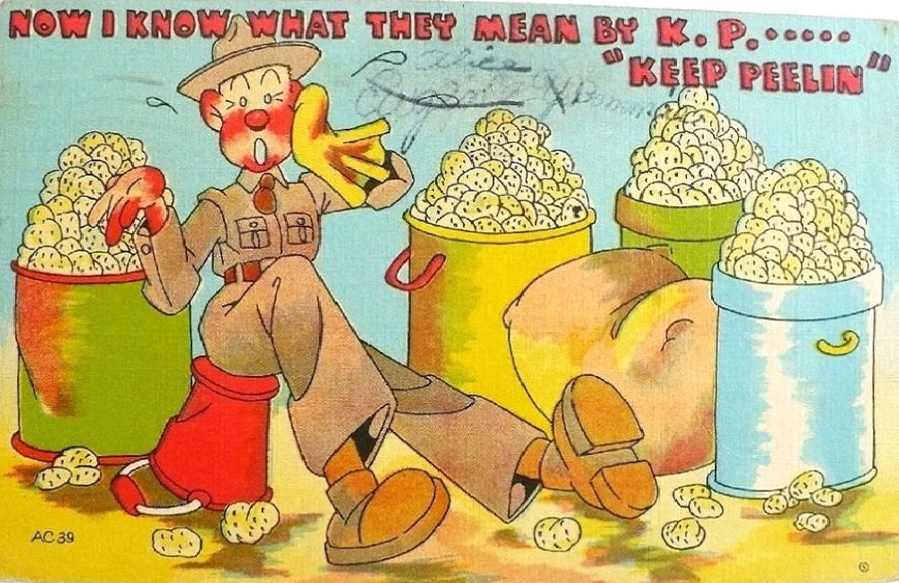 "Now I know what they mean by K.P. ... Keep Peelin' " vintage comic postcard. The 1945 postmark is accompanied by a World War 2 Postage FREE on this vintage postcard. Servicemen enjoyed free postage throughout the war. All a soldier or sailor had to do was write “Free” on the piece and the Post Office would deliver it. Even if a soldier wanted to mail the end of a C rations box as a postcard, the Post Office would deliver it free of charge. Mailed from Fort Riley.