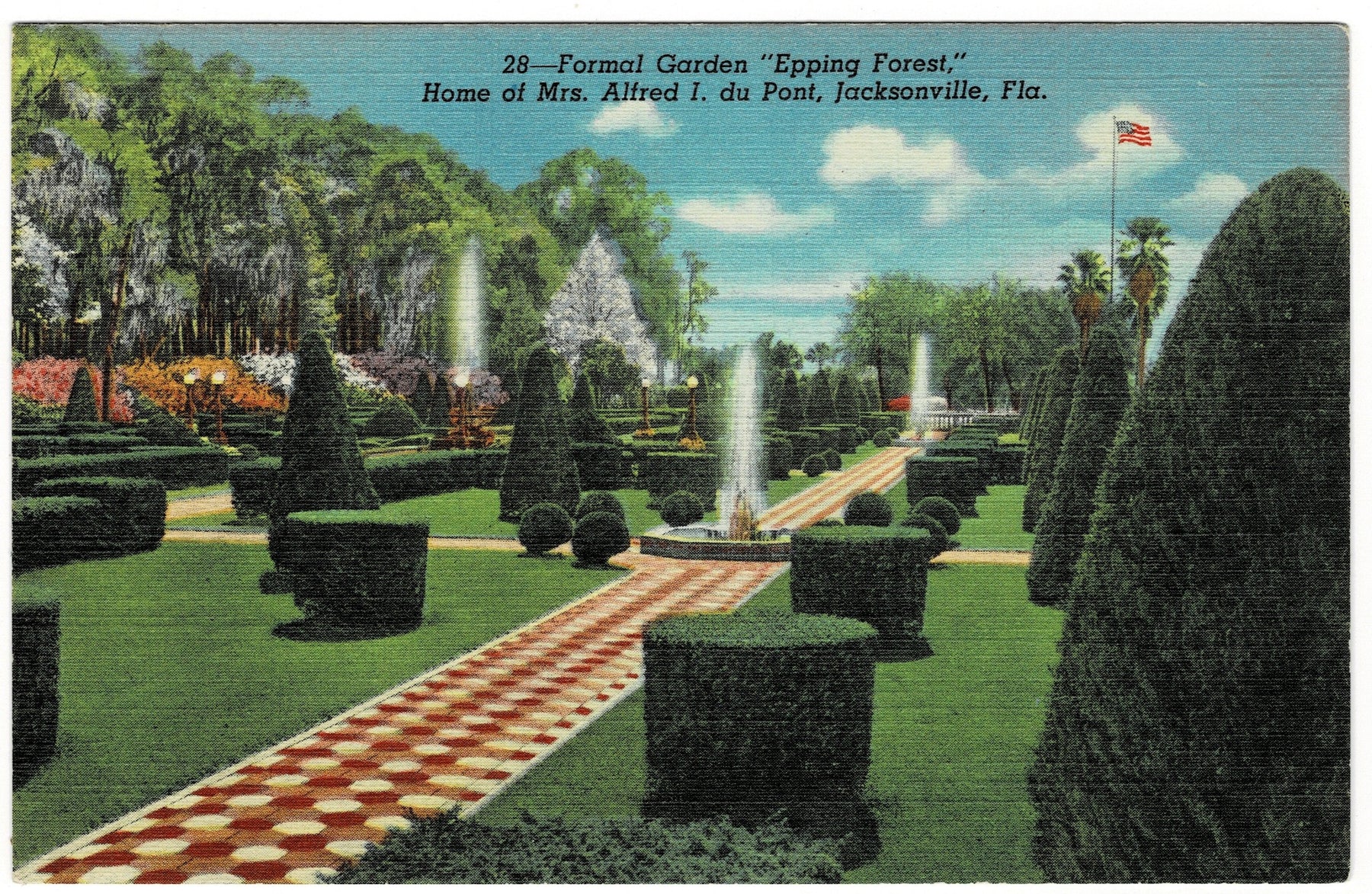 This 1947 postcard captures the serene beauty of the Du Pont Home Gardens in Jacksonville, Florida, a lush and peaceful retreat from the bustle of city life. The gardens surrounded the stately winter residence of Alfred I. du Pont, the famed industrialist and philanthropist. Set along the St. Johns River, the estate featured carefully landscaped grounds with fountains, winding paths, and tropical plantings that reflected both European elegance and Southern charm. By the late 1940s, the home and its gardens had become a local point of interest, admired by visitors for their tranquility and grandeur.