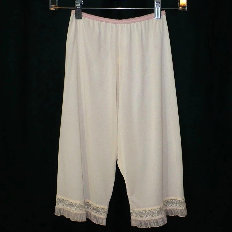 Playful pettipants - whether you are playing at Little Bo Peep, needing comfort under your many layers of crinoline petticoats, or simply a pretty layer of privacy! Such feminine beauty! Sheer perma-pleats plus a trace of lace - so luscious on run-proof nylon tricot! So much for so little from Get Lucky Vintage! Double-layer diamond gusset. Front and rear center seams keep the sides smooth and non-bulky. This style was introduced in 1957.