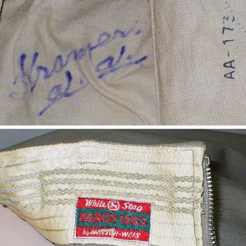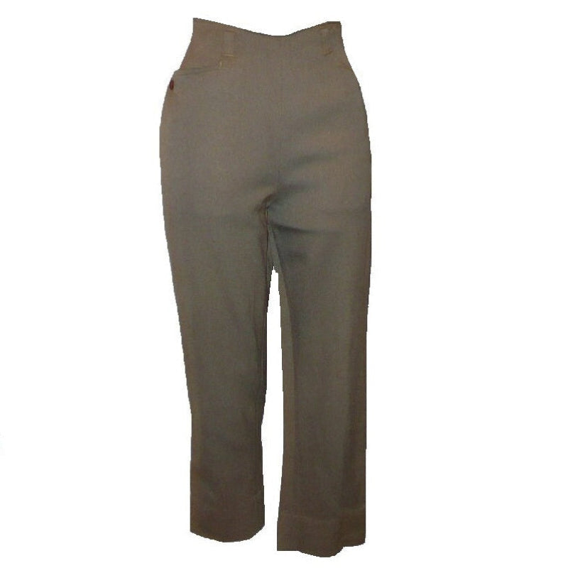 Embrace the authentic charm of the 1960s with these genuine Ranch Togs by Hersh-Weis. Designed as women’s ranch wear, these vintage pants feature two peg-front pockets with button closures and dropped belt loops, creating a classic Hollywood waist. The inside waistband has grip strips to keep your shirt perfectly in place. The left-side talon metal zipper fly and bar-tacked strain points ensure durability. Made from worsted wool. Label: White Stag Ranch Togs by Hersh-Weis. Modern size equivalent: X-Small, 2