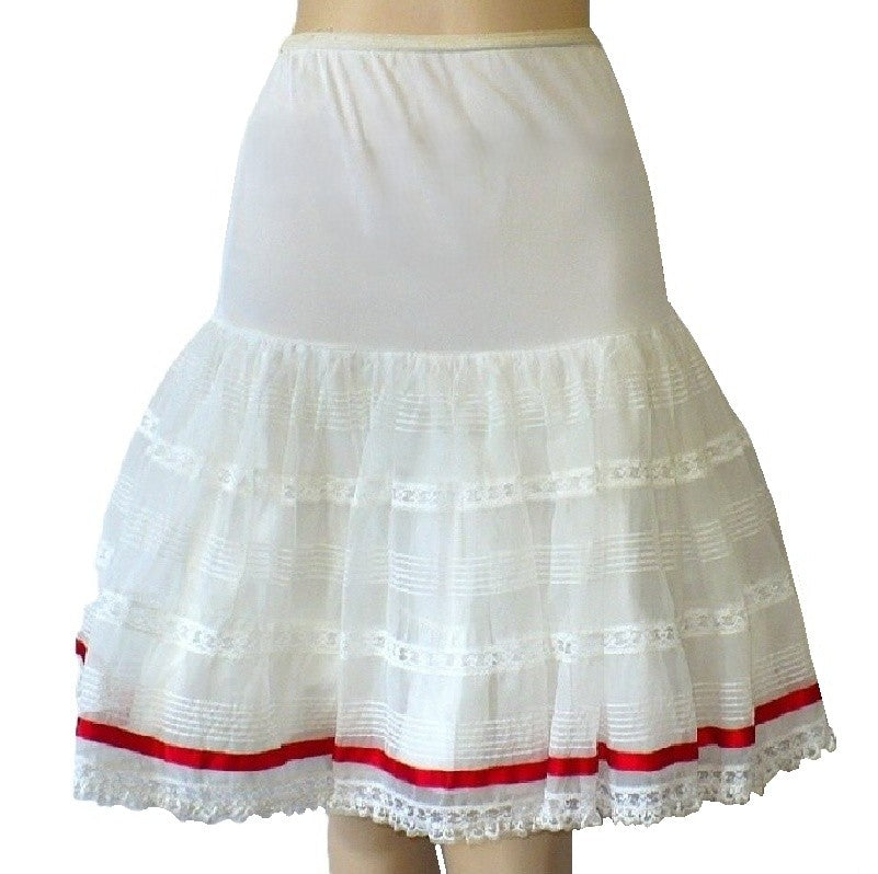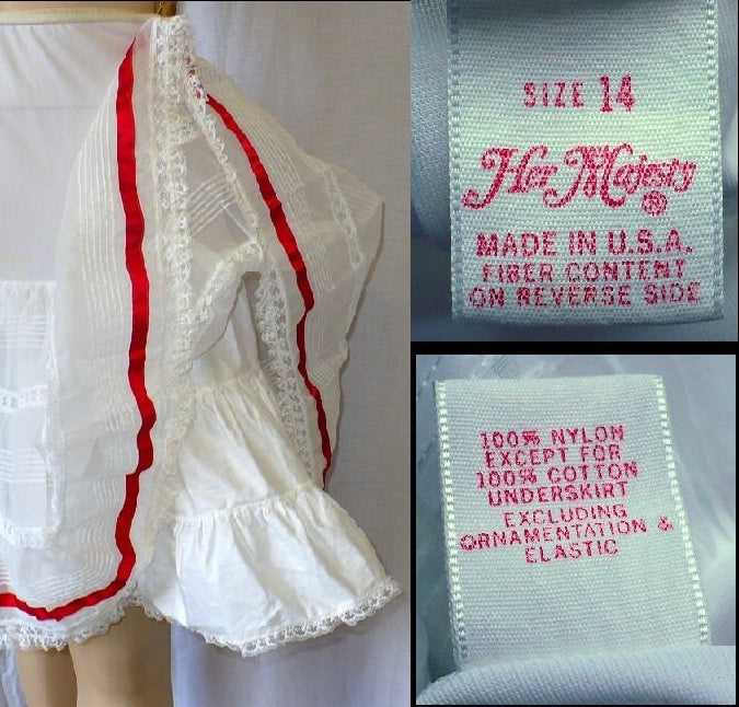 This party-ready petticoat half slip features a fitted nylon drop waist adorned with organdy, lace, and a red ribbon detail. The three-tiered ruffled petticoat inner slip adds a beautiful fullness, perfect for creating a voluminous silhouette. An authentic vintage piece from the 1960s, this half slip combines classic charm with playful elegance. Measurements are a modern size Large. Label: Size 14, Her Majesty, Made in USA. 100% Nylon except for 100% cotton underskirt - excluding ornamentation and elastic.