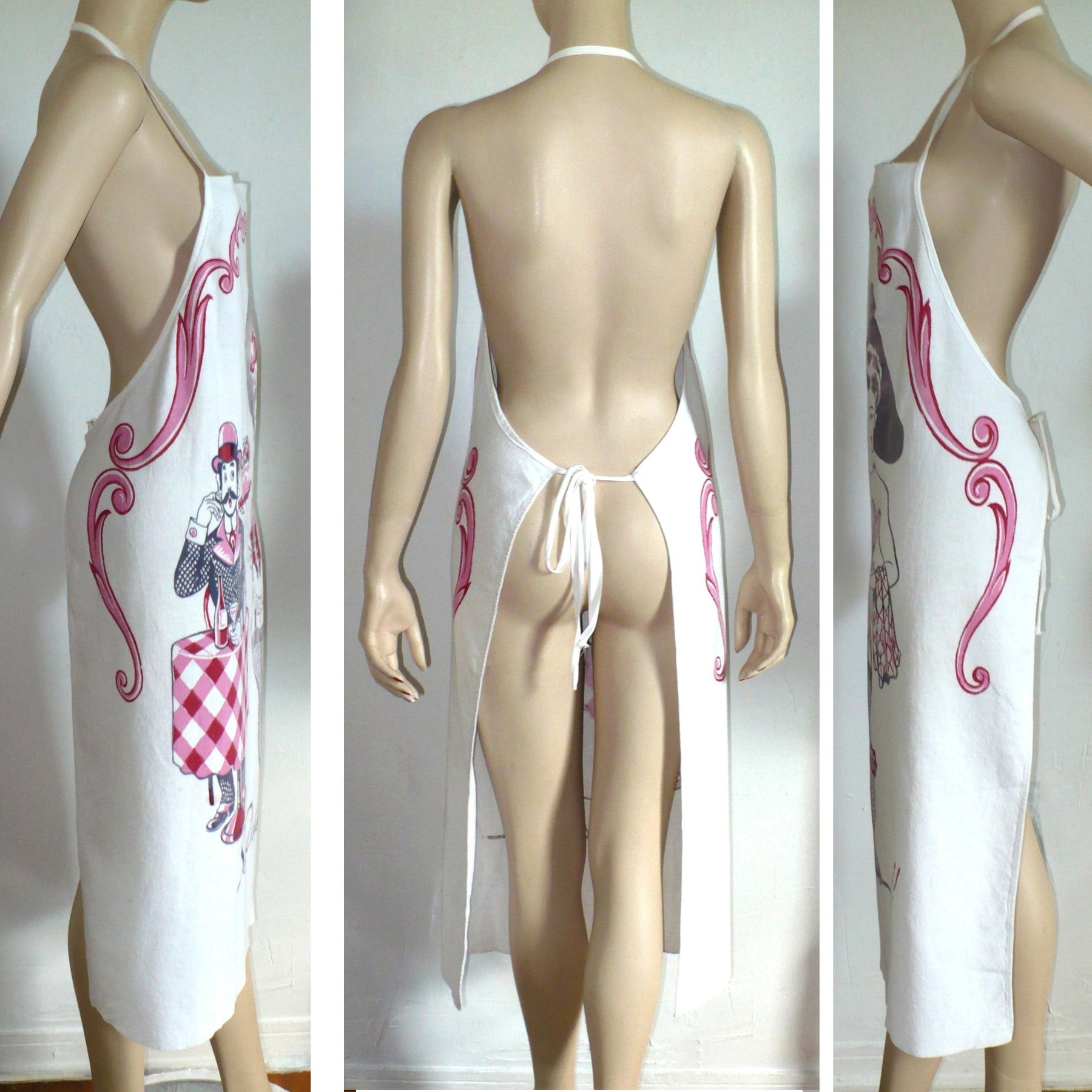 Delightful 1970s to 1980s vintage white bib apron with a vintage-style print featuring a man and woman in a playful, suggestive pose. The man, dressed in a suit and hat, sits at a table holding a drink, while the woman, in a burlesque-inspired outfit, stands beside him. The text "Some Dish!!" is printed at the bottom.