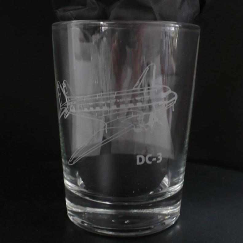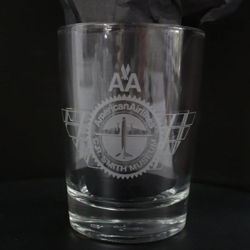 Estimated mid-1990s. Clear shot glass with the American Airlines CR Smith Museum logo on one side, and graphics of a DC-3 airplane on the other. Black tissue paper was put inside the glass for the images to help show the logos. Cursive "L" hallmark (Libbey Glass Company) and "25" mold number on the base.