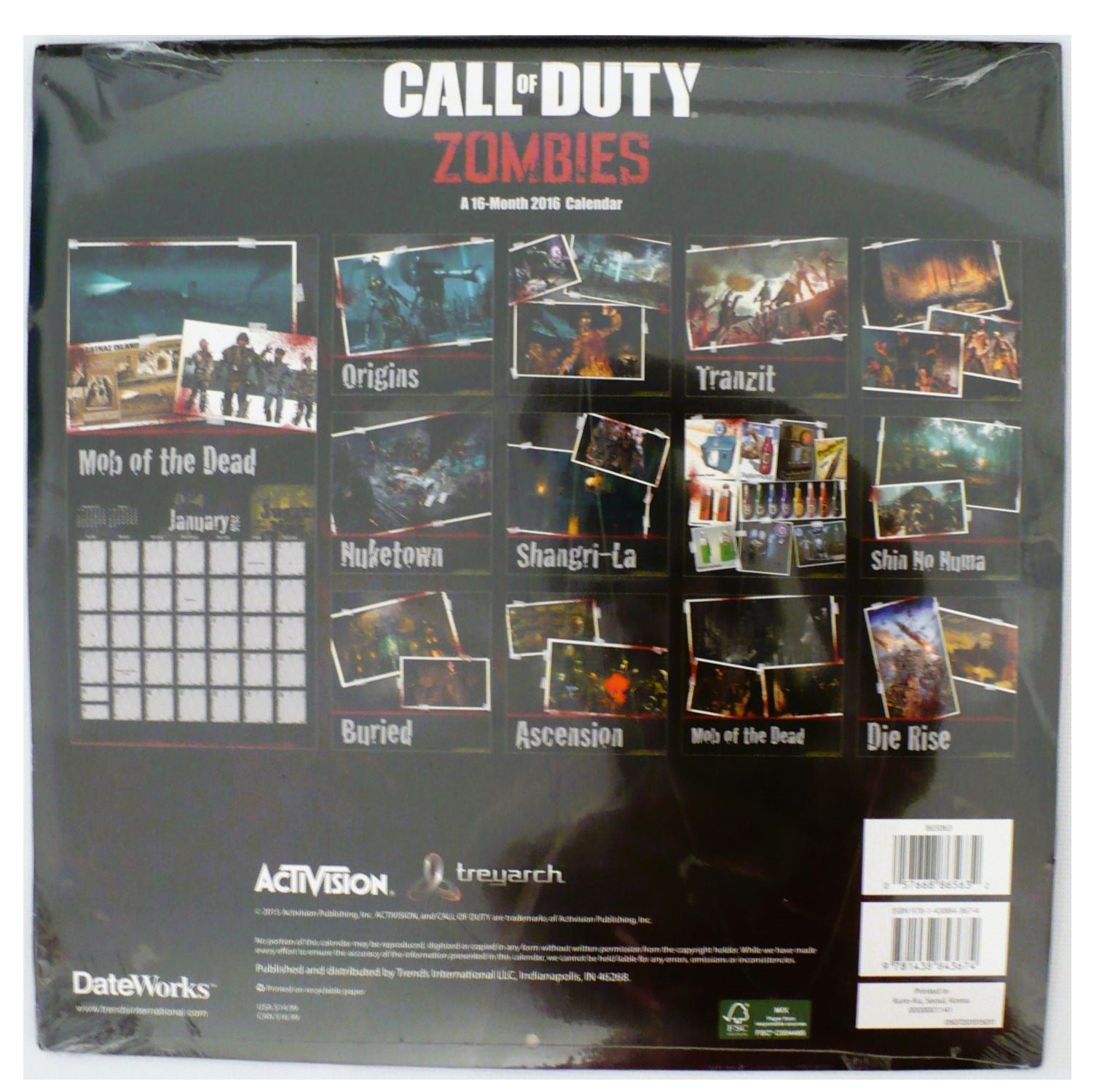 Calling all Call of Duty Zombies fans! This 12 x 12-inch 16-month wall calendar is a must-have for any enthusiast. Features include Mob of the Dead, Origins, Tranzit, Nuketown, Shangri-La, Shin No Numa, Buried, Ascension, Die Rise, and more!