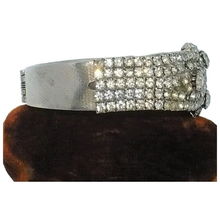 Imagine stepping back in time to the glamorous 1940s. Picture a dazzling bracelet that exudes old Hollywood charm. This vintage piece features prong-set rhinestones, meticulously arranged on a charnière clamper design. When you wear it, it sparkles like a thousand stars, capturing the magic of that era.